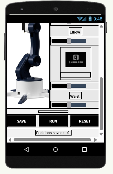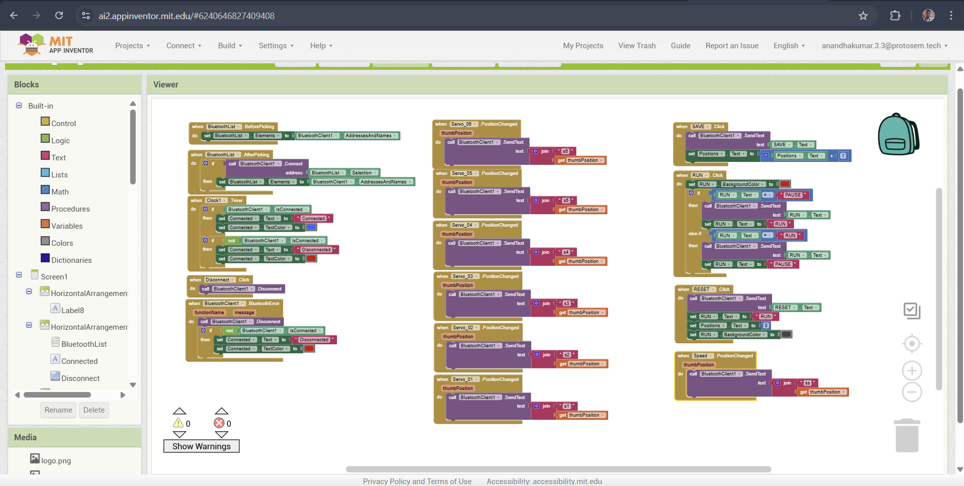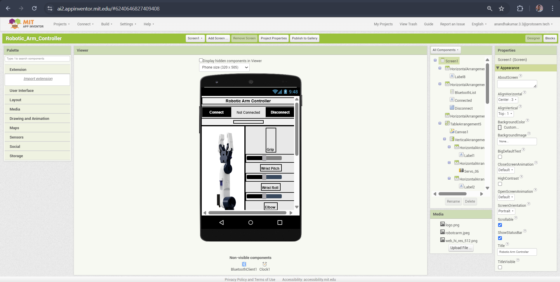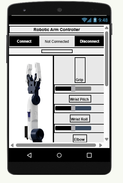 This Robotic Arm Controller App is designed to wirelessly control a robotic arm using an Android smartphone and an HC-05 Bluetooth module. Built with MIT App Inventor, the app features sliders to adjust individual servo positions and control speed, along with buttons for saving and running automated movements. The app sends commands via Bluetooth, allowing precise control over each joint. Users can program sequences of movements and execute them automatically, making the robotic arm adaptable for various tasks.