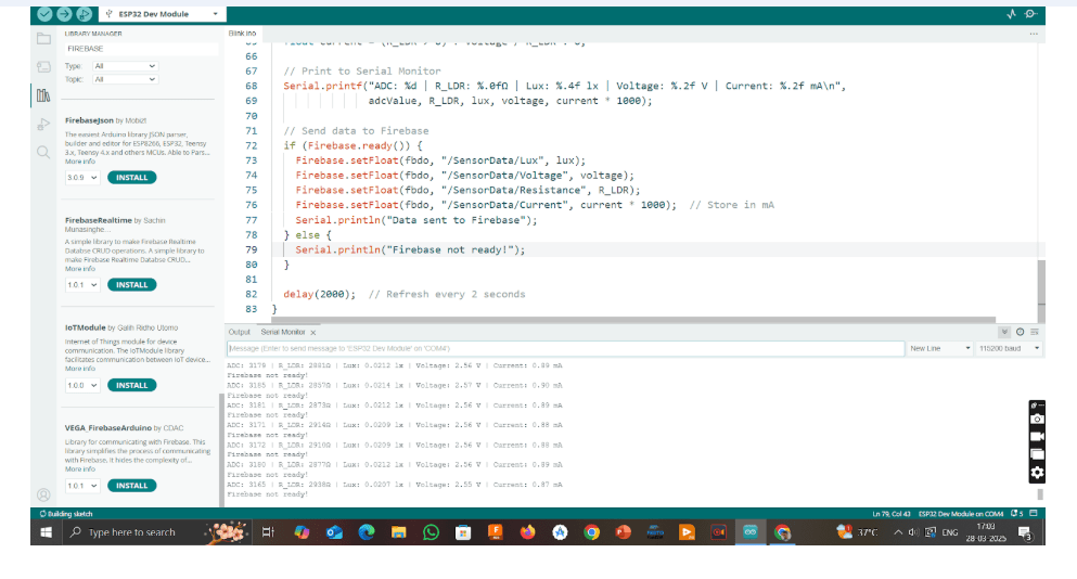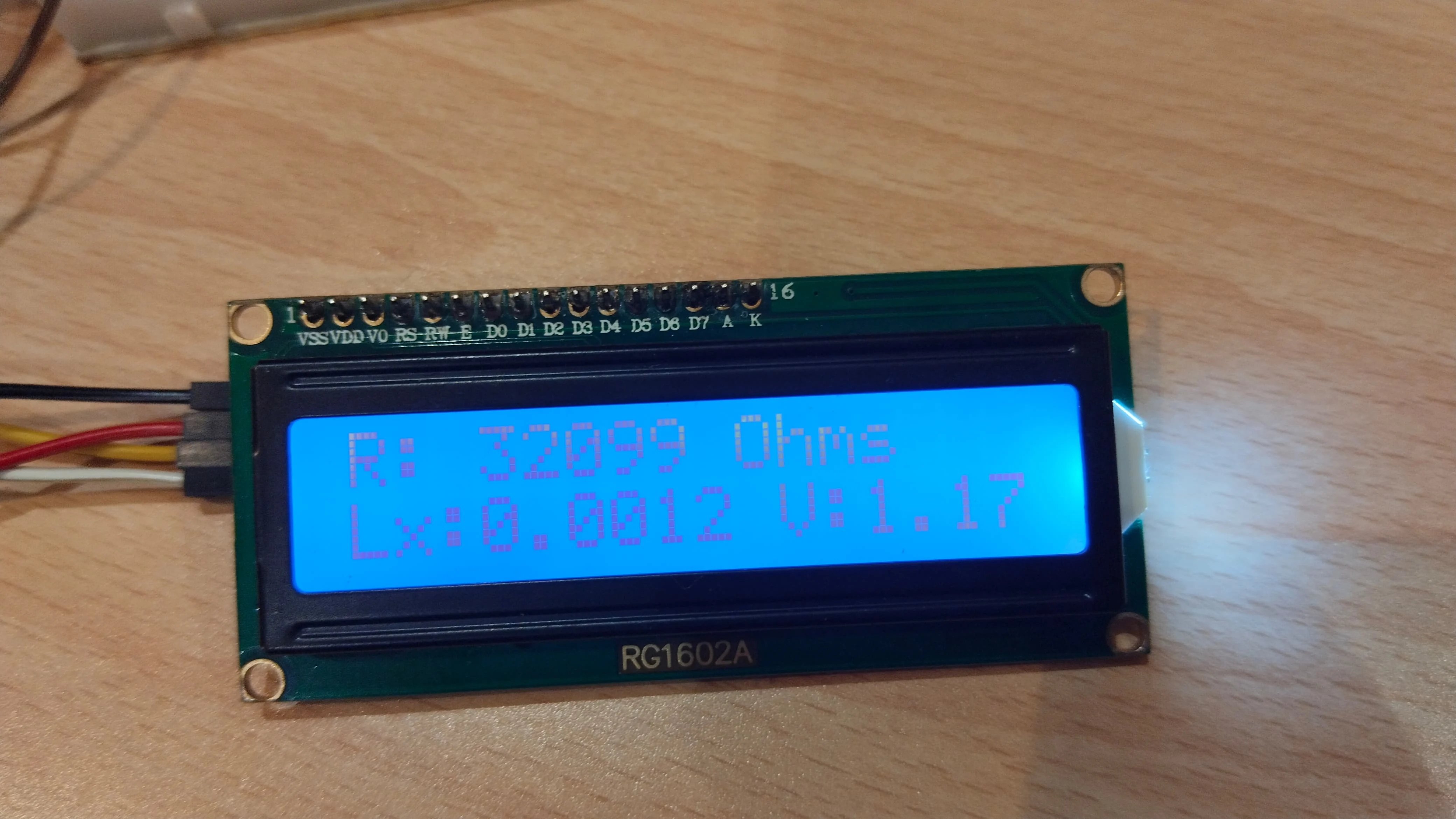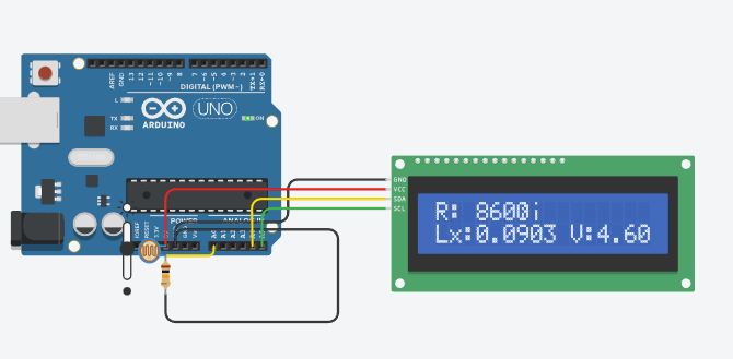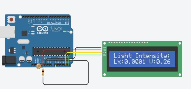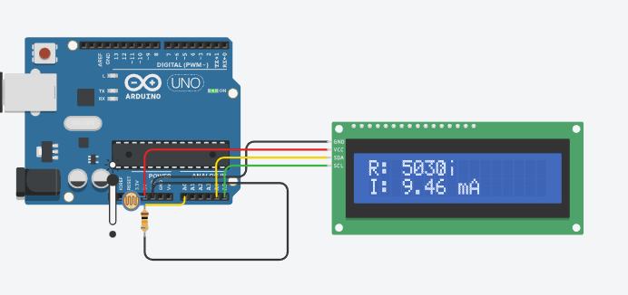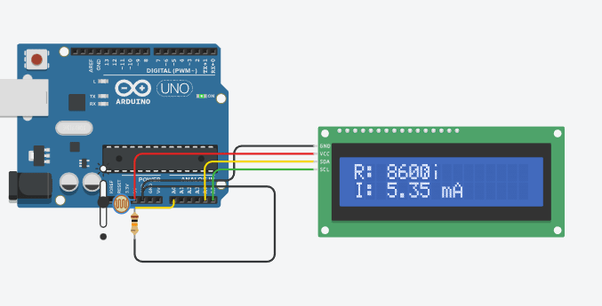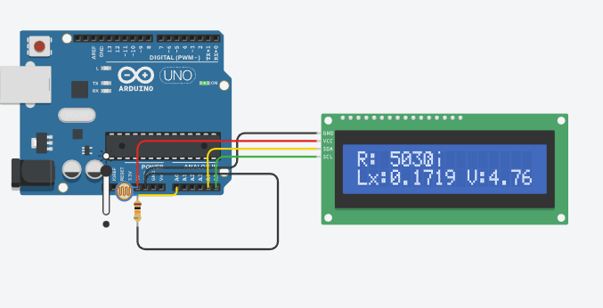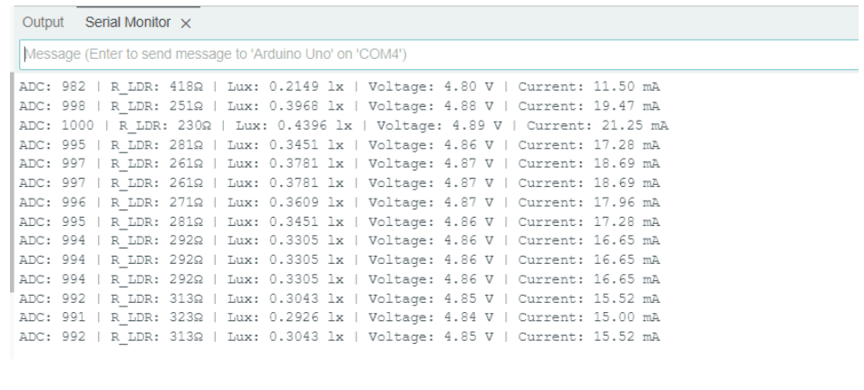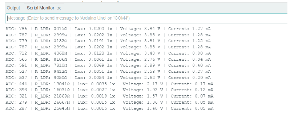 Code implemented ADC reading, voltage calculation, resistance conversion, lux estimation, current calculation and displayed results on LCD & serial monitor.