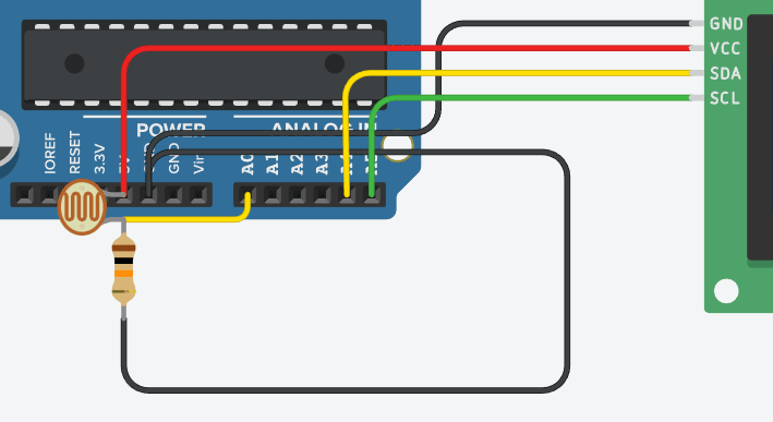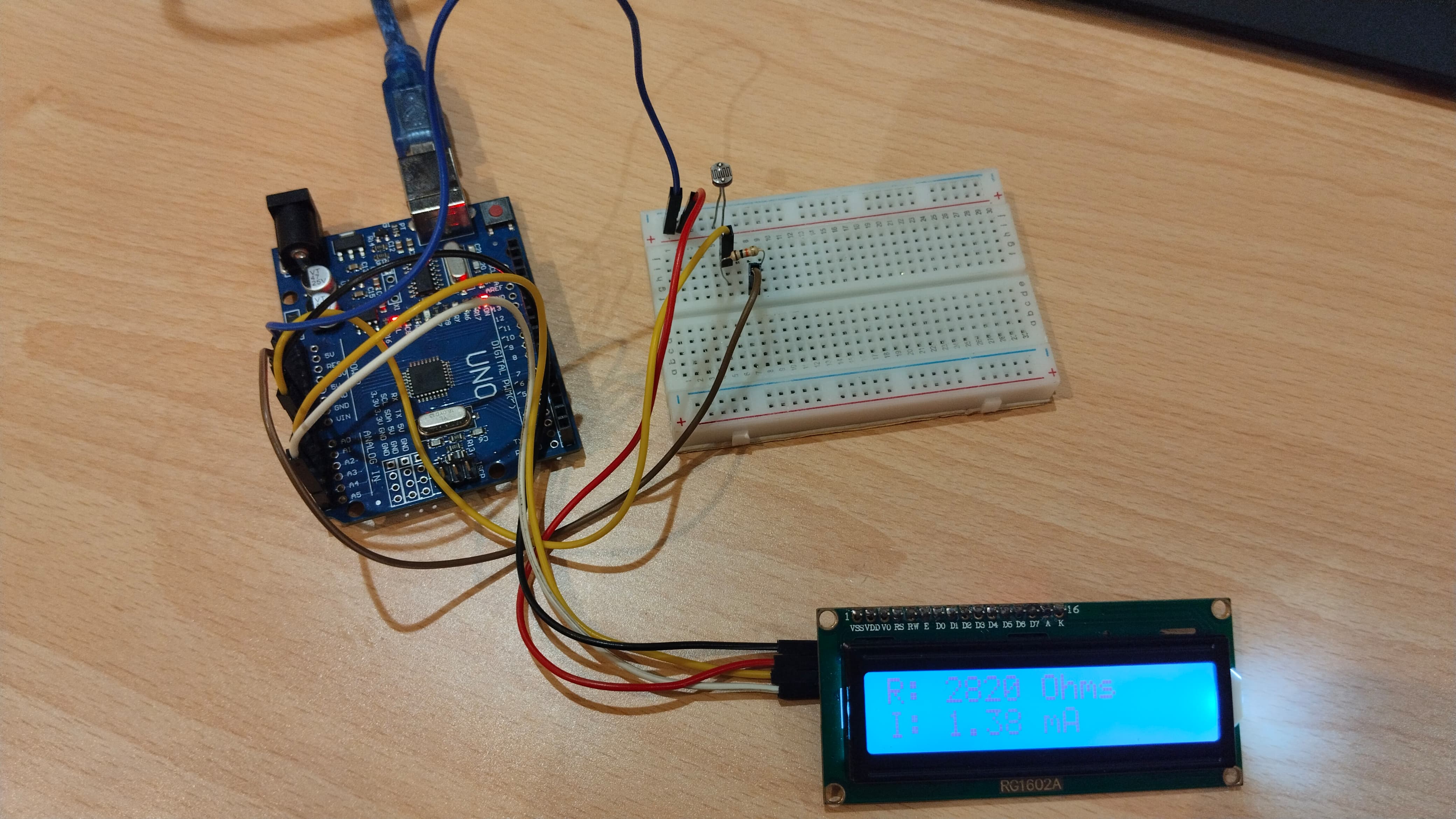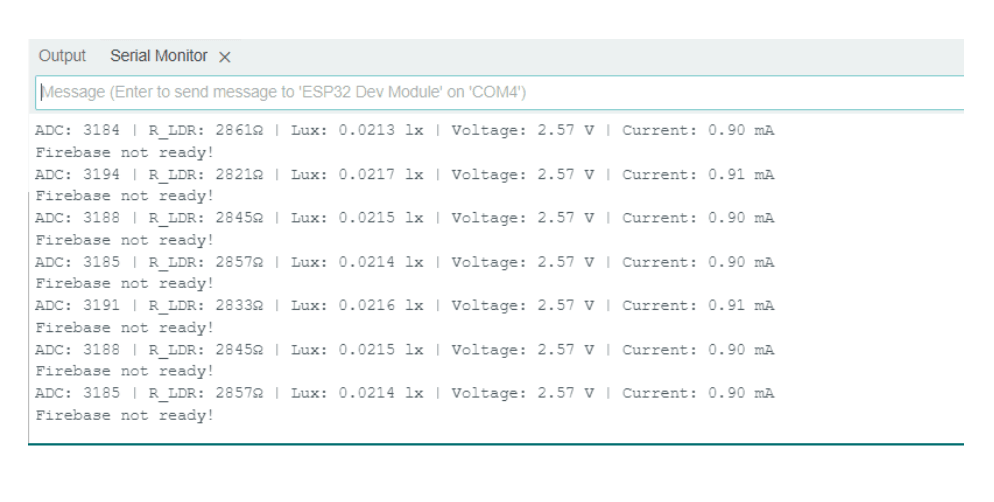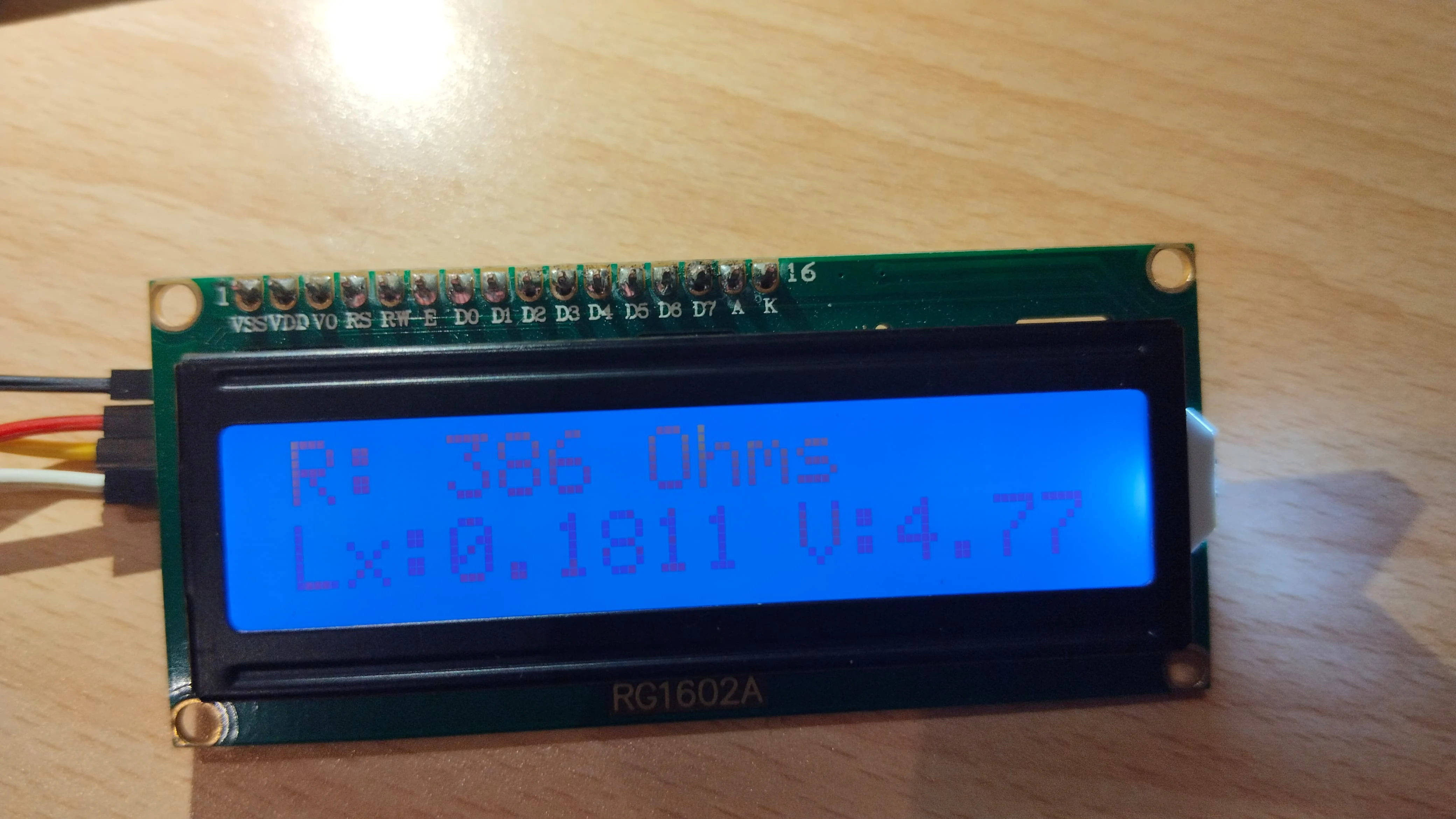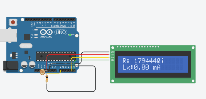 Code implemented ADC reading, voltage calculation, resistance conversion, lux estimation, current calculation and displayed results on LCD & serial monitor.