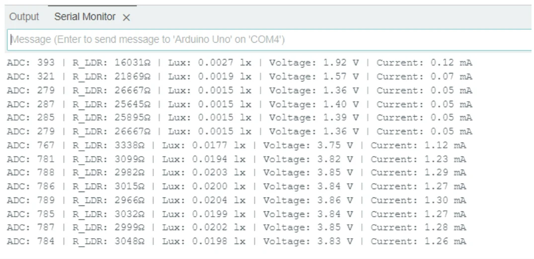 float current = (R_LDR > 0) ? voltage / R_LDR : 0; // Avoid division by zero